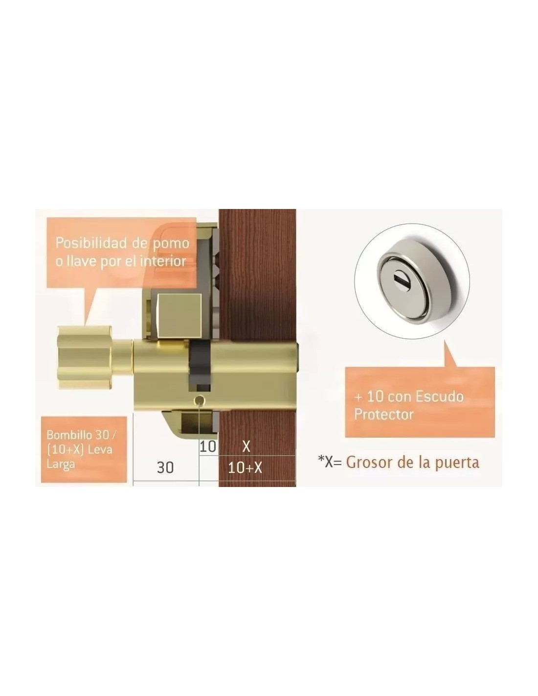 Para el cálculo de la longitud del bombillo necesario, se calcula teniendo en cuenta que, para la parte interior de la puerta la medida correcta es 30mm (ó 31, según fabricantes) y para la exterior, el grueso de la puerta (si la puerta, por ejemplo, tiene 40mm de grueso, el bombillo sería un 30/40). Si vamos a colocar un escudo, a la medida exterior se le debe sumar 10mm (en el ejemplo anterior, correspondería entonces un 30/50).